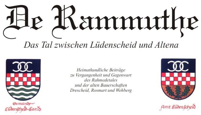 | Die Suche nach Großendrescheids Geschichte – Die Familie Wehberg vom Wehberg – Woher kommt der Name Lüdenscheid? – Gelebte Jugendzeit in Oberrahmede – Teilung der Rahmede vor 50 Jahren – Die VHS Rahmede - Familie Mühlhoff in Rosmart – Der Stenografenverein von 1891 – Abschied des HBV vom Bürgerhaus Paulusweg nach 13 Jahren – u.v.a.m. | |